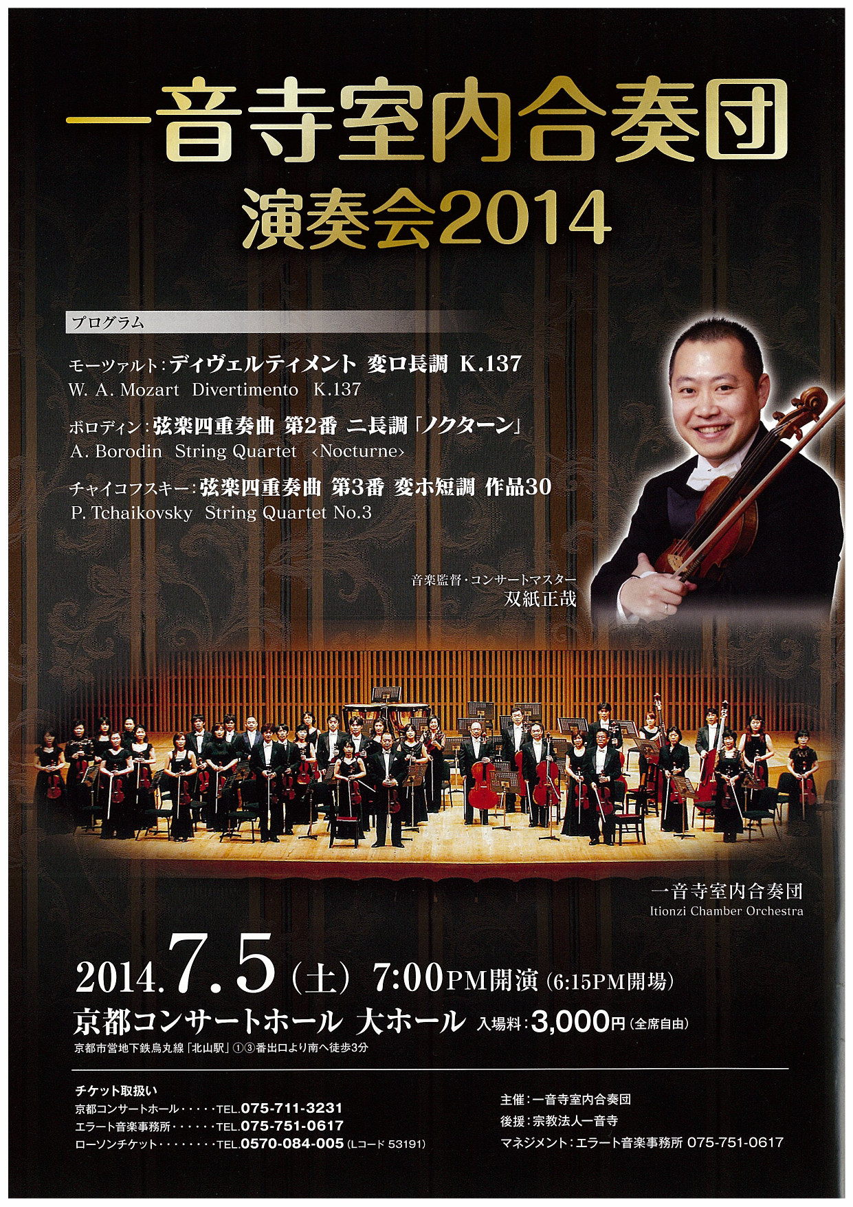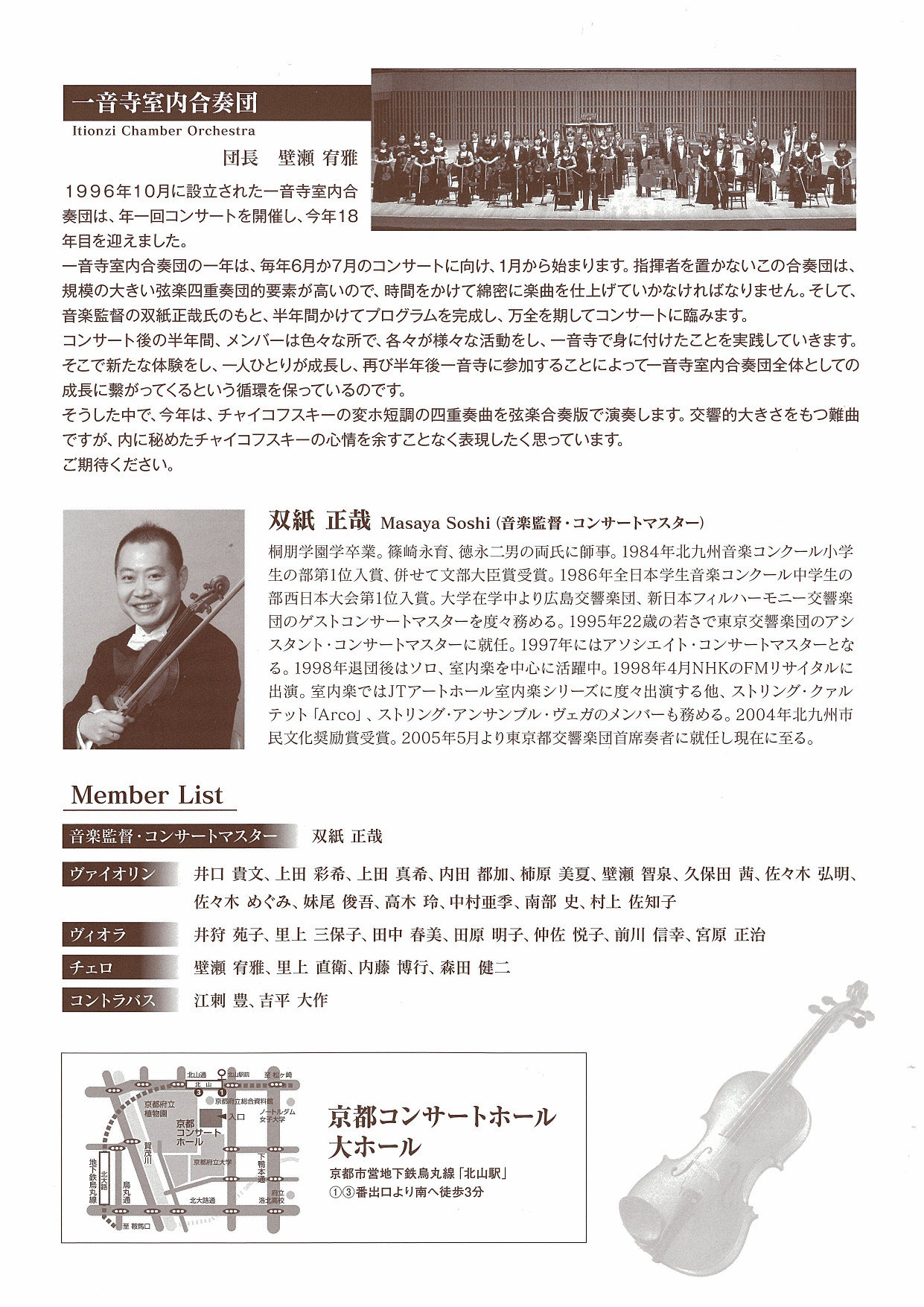 一音寺室内合奏団の一年は、毎年6月か7月のコンサートに向け、1月から始まります。指揮者を置かないこの合奏団は、規模の大きい弦楽四重奏団的要素が高いので、時間をかけて綿密に楽曲を仕上げていかなければなりません。そして、音楽監督の双紙正哉氏のもと、半年間かけてプログラムを完成し、万全を期してコンサートに臨みます。